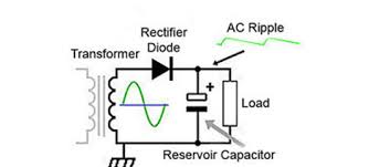 If the capacitor is very large, its voltage will hardly fall at all between charging pulses; this will produce a very small amount of ripple, but require very short pulses of much higher current to charge the reservoir capacitor. Both the input transformer and the rectifier diodes must be capable of supplying this current. This means using a higher current rating for the diodes and the transformer than would be necessary with a smaller reservoir capacitor. There is an advantage therefore in reducing the value of the reservoir capacitor, thereby allowing an increase in the ripple present, but this can be effectively removed by using a low pass filter and regulator stages between the reservoir capacitor and the load. This effect of increasing reservoir size on diode and transformer current should be born in mind during any servicing operations; replacing the reservoir capacitor with a larger value than in the original design "to reduce mains hum" may seem like a good idea, but could risk damaging the rectifier diode and/or the transformer.