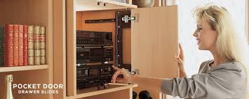 Commonly called a pocket or flipper door slide, it is used in applications such as media or entertainment centers and armoires to slide or pocket the doors back into the body of the unit allowing full access to the front of the unit. Accuride 123 Pocket Door Slide 12" With Hinges $45.25 $56.26 Accuride 123 Series Flipper Door Slide Accuride 123 Pocket Door Slide 18" With Hinges $47.65 $59.17 Accuride 123 Series Flipper Door Slide Accuride 1321 Pro Pocket Door Slide 20" With Hinges $69.20 $86.45 Accuride 1321 Pro Pocket Flipper Door Slide Accuride 1321 Pro Pocket Door Slide 22" With Hinges $69.85 $87.32 Accuride 1321 Pro Pocket Flipper Door Slide KV 8080 Pocket Door With Hinges 16" $44.05 - $37.28 $54.62 KV 8080 Pivot Door Slides KV 8080 Pocket Door With Hinges 18" $44.58 - $37.72 $55.28 KV 8080 Pivot Door Slides KV 8080 Pocket Door With Hinges 20" $45.05 - $38.12 $55.86 KV 8080 Pivot Door Slides Accuride 1321 Pro Pocket Door Slide 16" With Hinges $67.85 $84.82 Accuride 1321 Pro Pocket Flipper Door Slide Accuride 123 Pocket Door Slide 22" With Hinges $49.25 $61.16 Accuride 123 Series Flipper Door Slide KV 8080 Pocket Door With Hinges 24" $46.20 - $39.09 $57.06 KV 8080 Pivot